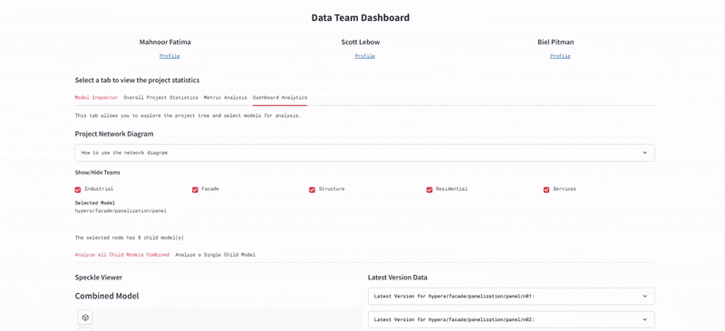 The front-end was a bespoke web app built with Streamlit. It served as the project's "mission control," visualizing the extracted data. It featured interactive calculators, 3D model viewers, and comparative graphs, allowing stakeholders to view both individual team performance and the holistic health of the Hyper-Building.