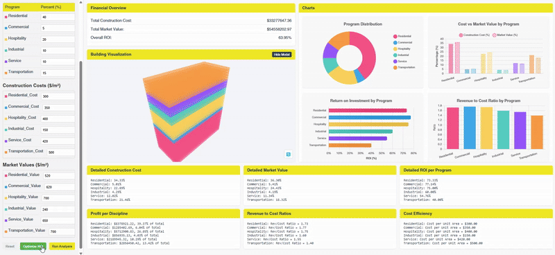 The result is an approach that dynamically binds every square meter of geometry to a live financial metric. By wrapping this sophisticated backend in an intuitive Vue.js frontend, we provided a seamless, interactive dashboard where programmatic shifts are instantly reflected in a comprehensive suite of financial performance metrics, offering unprecedented clarity and control.