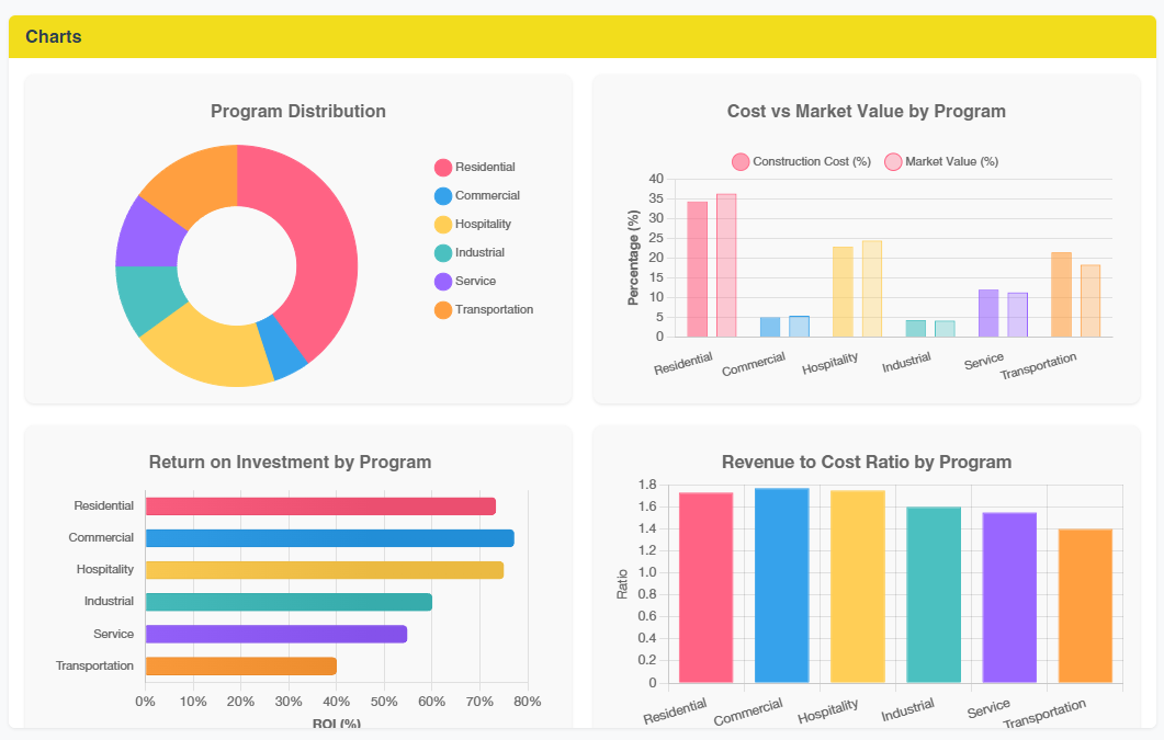 The platform delivered highly detailed, discipline-specific financial breakdowns that go far beyond standard top-line estimates. The results generated a comprehensive suite of charts and data points, including profit per discipline, precise revenue-to-cost ratios for each program type, and overall cost efficiency metrics. By isolating the financial performance of individual sectorslike hospitality versus industrial spacethe engine provided stakeholders with a transparent, highly granular understanding of where value is created or lost. This depth of information is critical for mitigating risk and securing investment confidence in competitive real estate markets.
