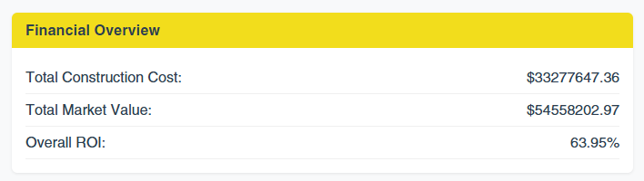 This data is instantly pushed to the frontend, where the user is presented with a centralized financial overview displaying total construction costs, total market value, and overall ROI.