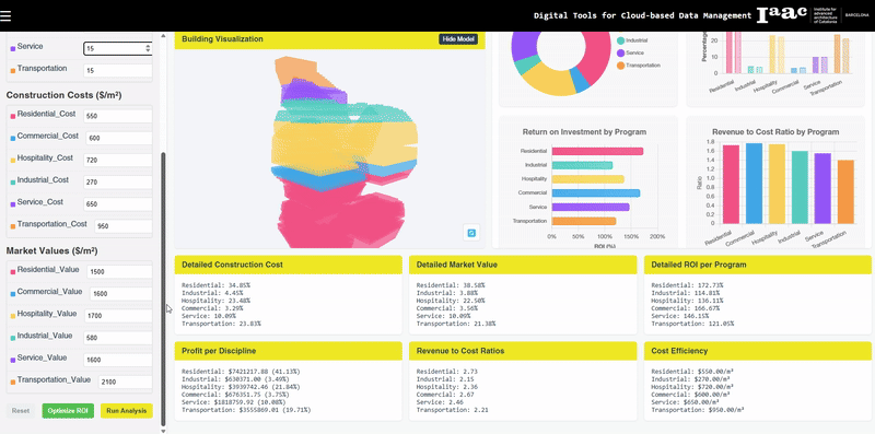 The successful deployment of the "Optimize ROI" function proved that computational logic can actively improve real estate profitability. By running iterative tests against localized market data, the system automatically identified the most efficient way to distribute programs across the building volume. The result was a mathematically optimized spatial configuration that increased the projected return on investment, providing developers with an actionable, data-backed roadmap for finalizing their building's internal layout to achieve the highest possible economic efficiency.